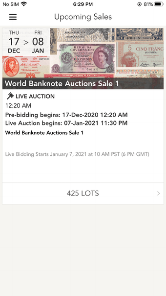 ด้วย World Banknote Auctions ผู้ใช้สามารถดูตัวอย่าง ดูและประมูลในการประมูลได้โดยตรงจากอุปกรณ์มือถือหรือแท็บเล็ตของพวกเขา แอปนี้มีคุณสมบัติต่างๆ เพื่อเพิ่มประสบการณ์การประมูล ผู้ใช้สามารถลงทะเบียนได้อย่างรวดเร็วและง่ายดายเพื่อให้สามารถเข้าร่วมการขายที่กำลังจะมาได้อย่างราบรื่น